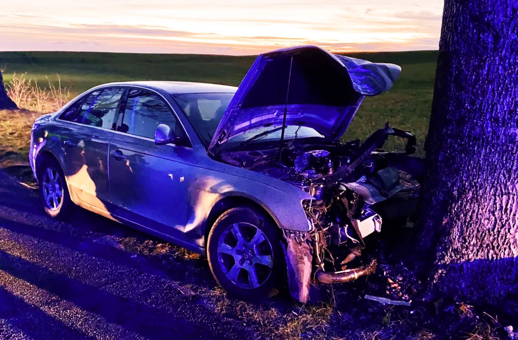 Do poważnego wypadku doszło w piątek 8 kwietnia na drodze pomiędzy miejscowościami Pluty i Dobino. W okolicach godziny 19:40 samochód osobowy z niewiadomych jeszcze przyczyn wypadł z drogi i roztrzaskał się o przydrożne drzewo.